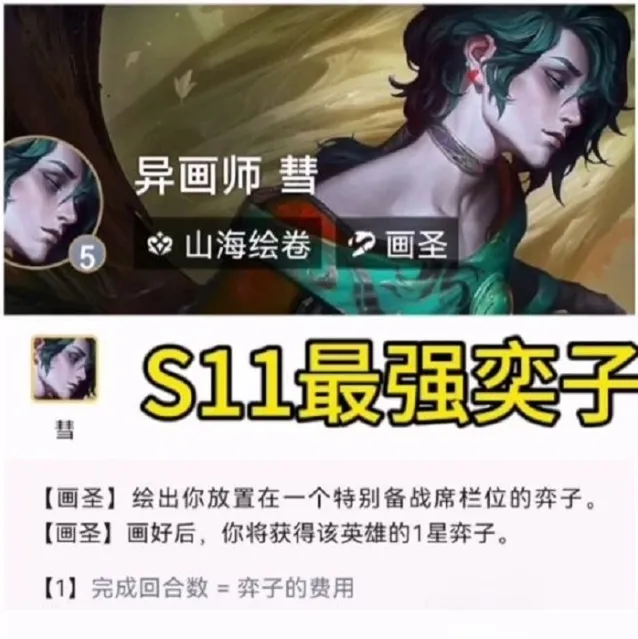羁绊效果:画圣会在在备战席上绘画出一个格子,在玩家对战回合后,画圣会研究备战席上格子的单位两次。研究透彻后,画圣会绘出该单位的1星弈子。