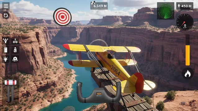 3、飞行至峡谷区域,飞机停靠在狭窄的木桥上,玩家需调整姿态并利用仪表盘监控速度与高度,准备起飞或降落。