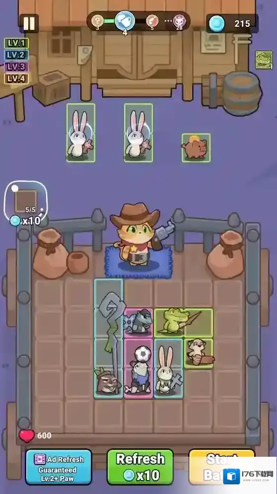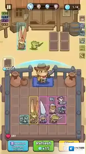 2、进入关卡后玩家可以将初始伙伴放入背包,相同的伙伴可以合并提升等级,点击refresh可以获得新的伙伴。
