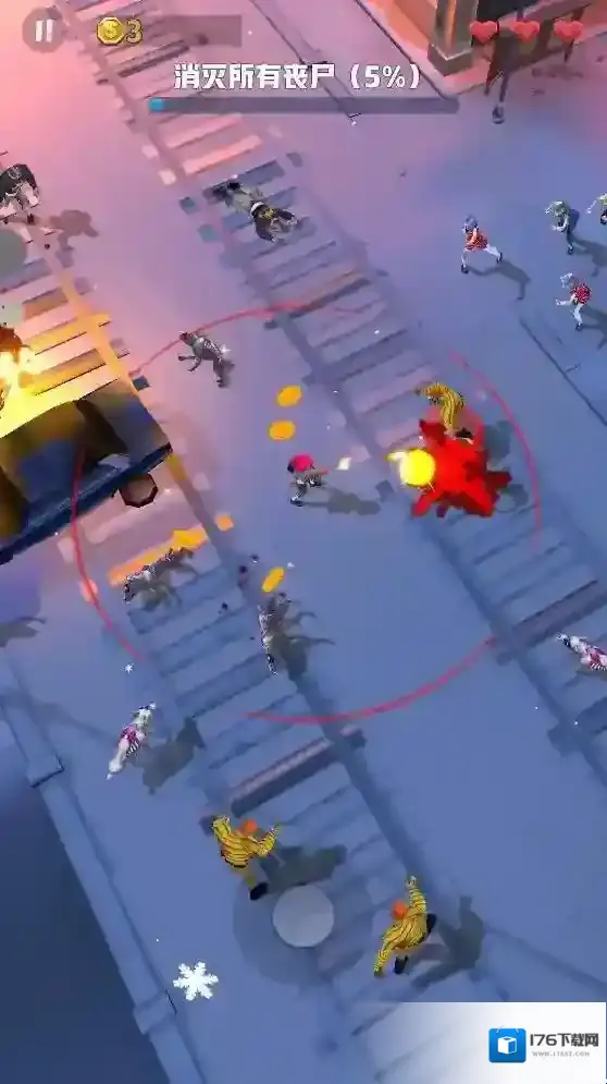 游戏中的玩法比较简单,玩家只用操控角色移动就可以,角色会自动消灭进入范围的敌人,但是不要大意了,即时可以消灭进入范围的敌人,但是一次进入太多敌人也是会受到伤害的,灵活移动躲避这些僵尸,不断战斗在这个末日世界里生存下去。