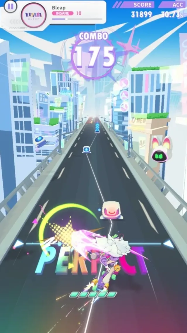 闪音跃动Bleap是一款音乐节奏判定+横版跑酷的动感游戏,将关卡中的所有平台、障碍、跳跃点的出现时机,都严格同步于背景音乐的鼓点和旋律。你需要操控一个Q版卡通角色,在色彩明快的城市街道中奔跑,用耳朵聆听节奏,用眼睛预判路径,在正确的节拍上点击屏幕完成跳跃、滑行等动作,实现一场视听同步的炫酷奔跑。