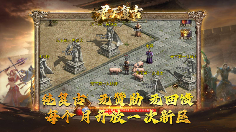 君天复古,176复古三职业传世版本,长周期复古服,60天左右开放一次新区,战神装备为顶级装备,并且只可以打怪获得!游戏会根据大家的进度合理的去开房地图,让所有玩家可以保持在同一起跑线,公平公正,人人都有机会逆袭!不仅如此,本服内还有每日王城任务,可以免费获得海量的经验,提升等级非常的迅速!正式开区之后,达到一定等级即可获取金币和绑元奖励,等级抵御排行榜第一的还能获得一定的打怪经验,让所有人都机会到顶!